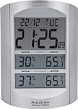 Perfect for your home, RV or office this large display weather station will make it quick and easy to view the time and temperature at a glance. The Celestron Large Format LCD Weather Station is a wireless, easy to set up, free-standing unit or can also be displayed on the wall. The wireless outdoor sensor transmits data to the receiver where the information is displayed on a large format LCD screen. Features bold, easy-to-read digital time display, alarm clock with snooze, calendar, as well as indoor and outdoor temperature and humidity readings.