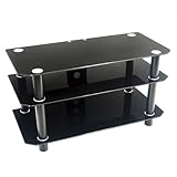 Sleek and modern, this all-black Contempo TV stand from Walker Edison provides efficient and accessible storage space for televisions, game consoles, and DVD players. Crafted from beveled tempered safety glass and metal tubing legs, the stand holds up to 250 pounds on its top shelf. Two additional shelves below add plenty of space for components. A silk-screened coating overall creates the deep black color, while chrome glass mounts gleam in attractive contrast. For tidiness, a cutout panel in back keeps cords organized and out of sight. Measuring 22 by 42 by 22 inches, the stand ships ready to assemble and is also available in a clear/silver version.